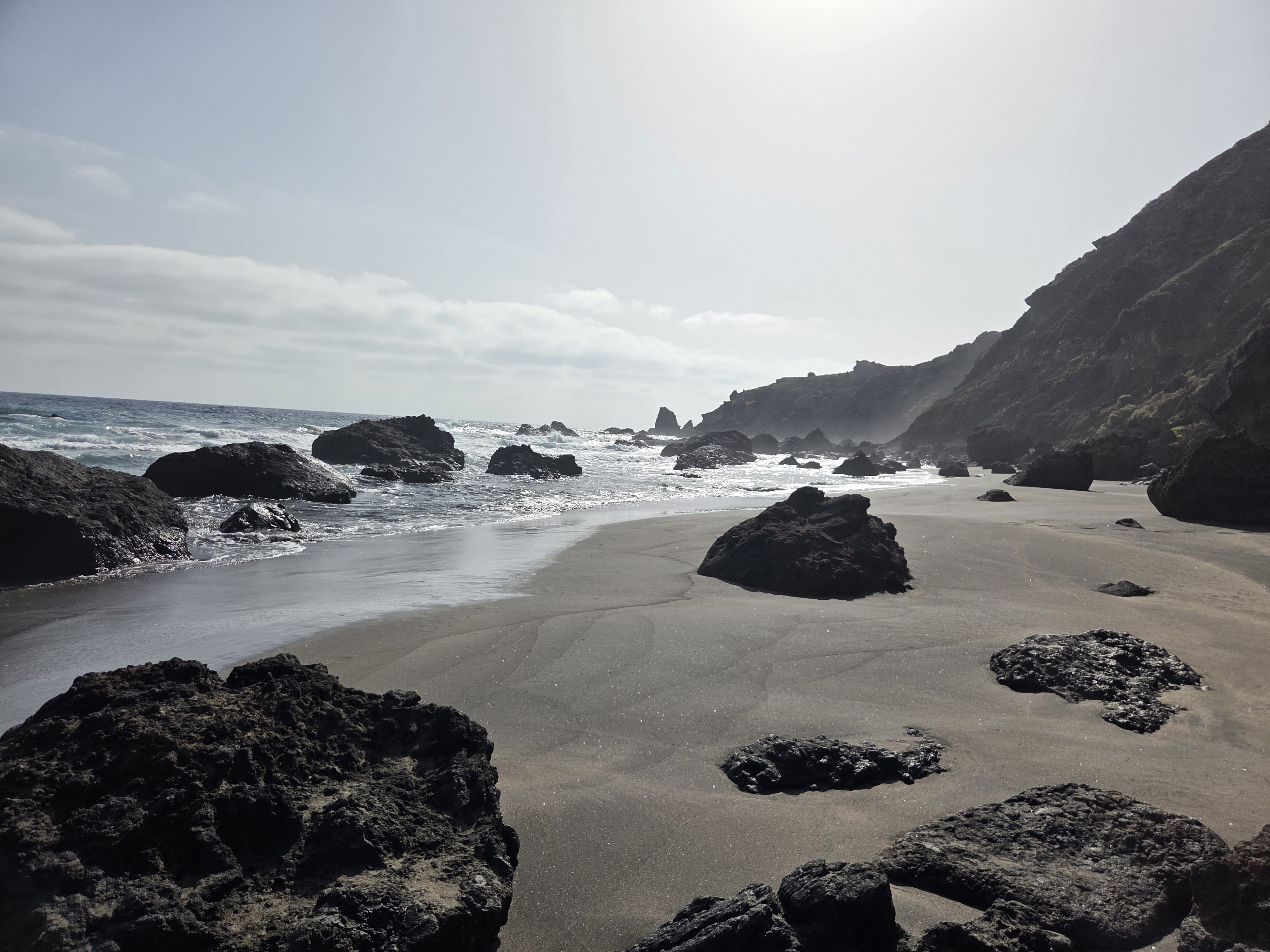 Die Küste ist ein Lehrbuch für vulkanische Formen: kantige Basaltblöcke neben rund geschliffenem Kies, dazwischen glitzernde Sandzungen. Zwischen den Felsen bilden sich bei ruhiger See kleine, wärmere Pfützen – perfekt, um einfach die Füße ins Wasser zu hängen und die Gischt zu beobachten.