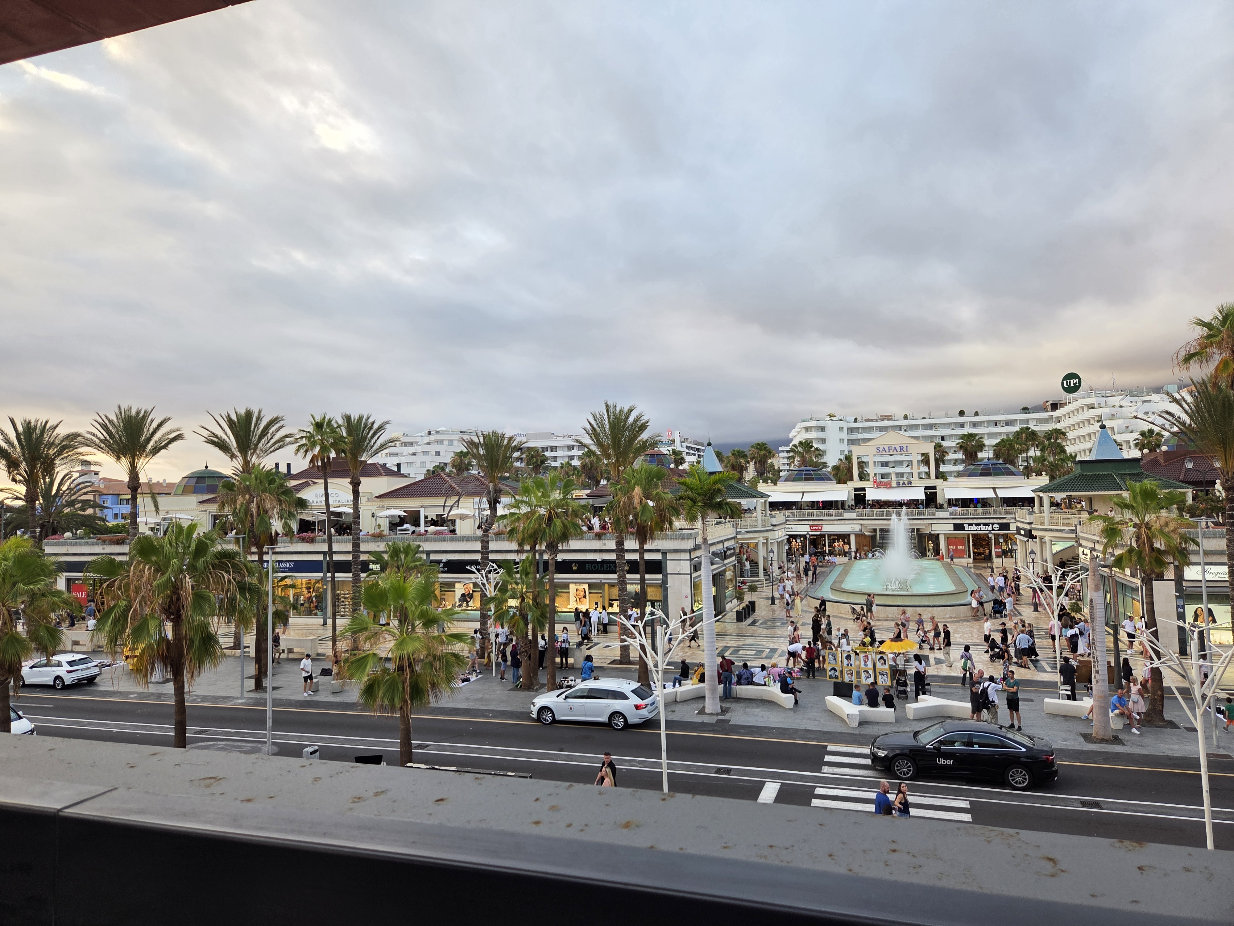 Zum Einstieg bietet sich der Blick von oben an: Von der Terrasse aus sieht man den belebten Platz mit Springbrunnen, Geschäften und Restaurants – perfekt, um sich zu orientieren und die beste Zeit für den Konzertstart zu wählen.