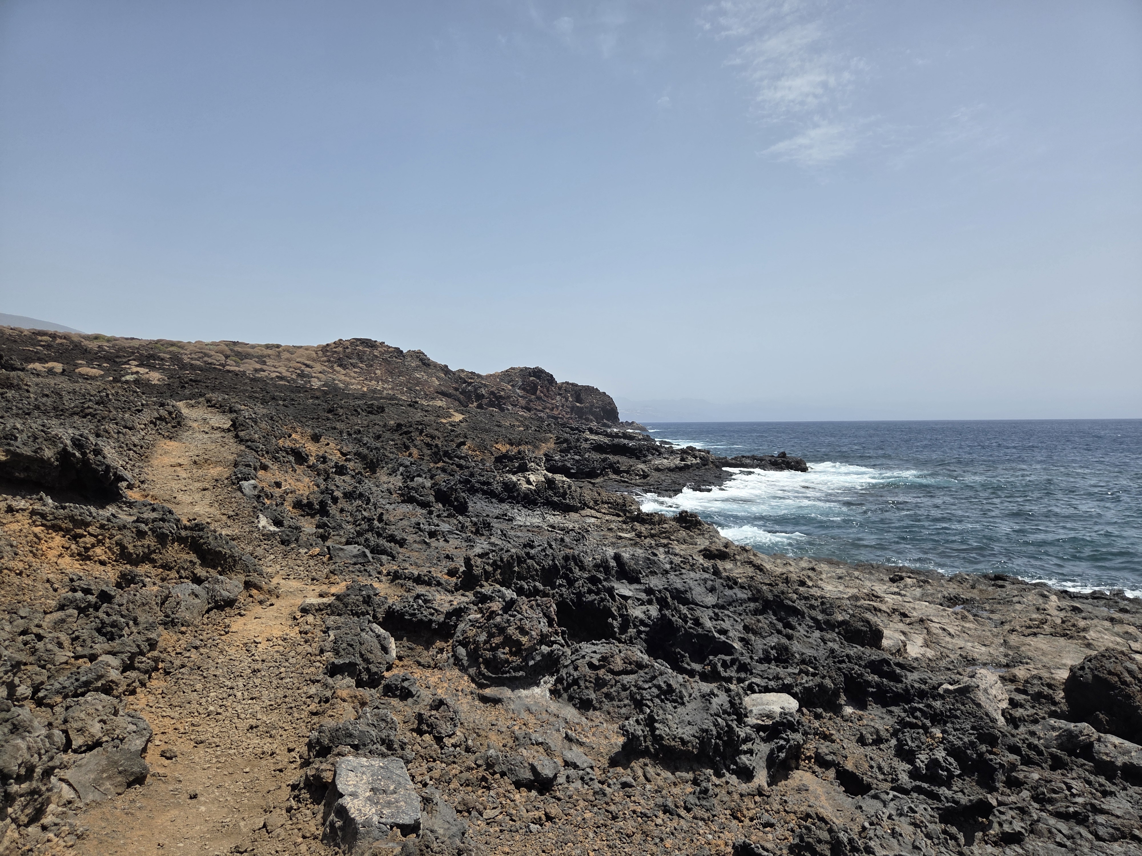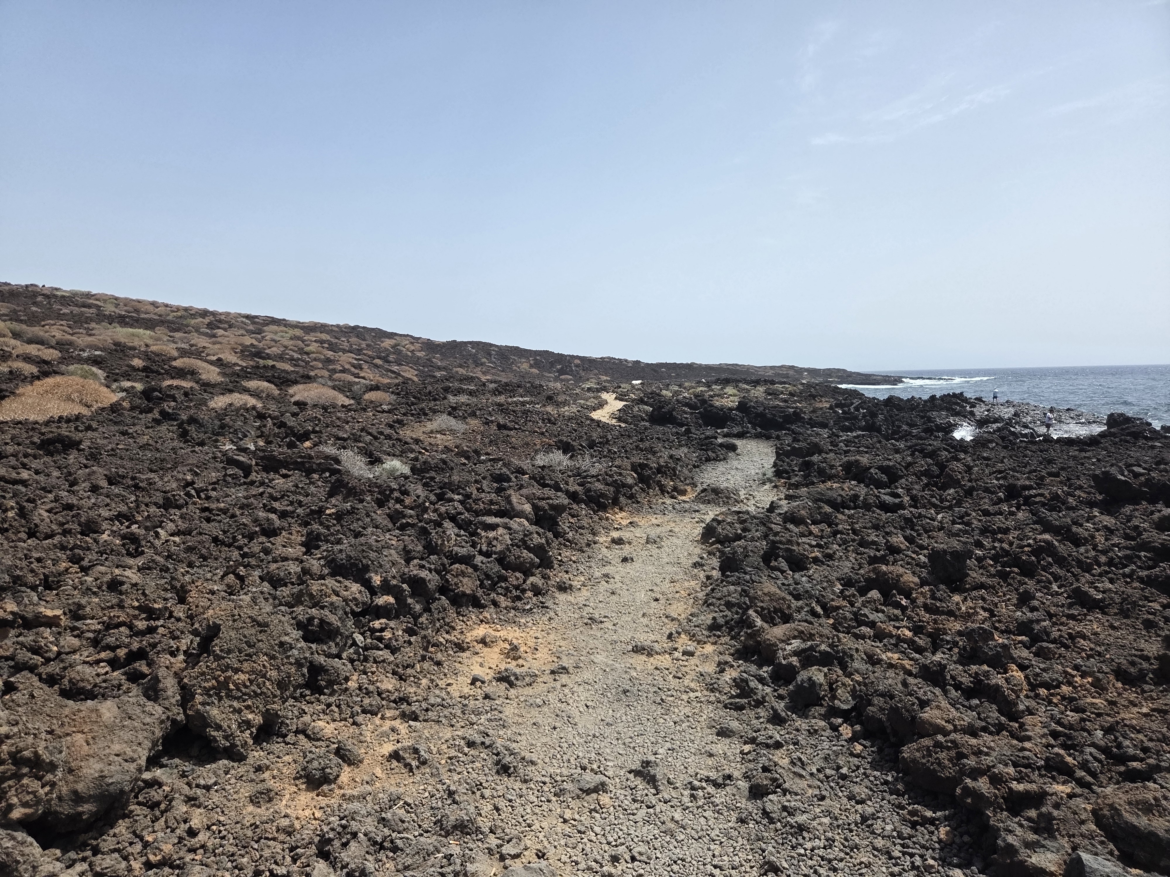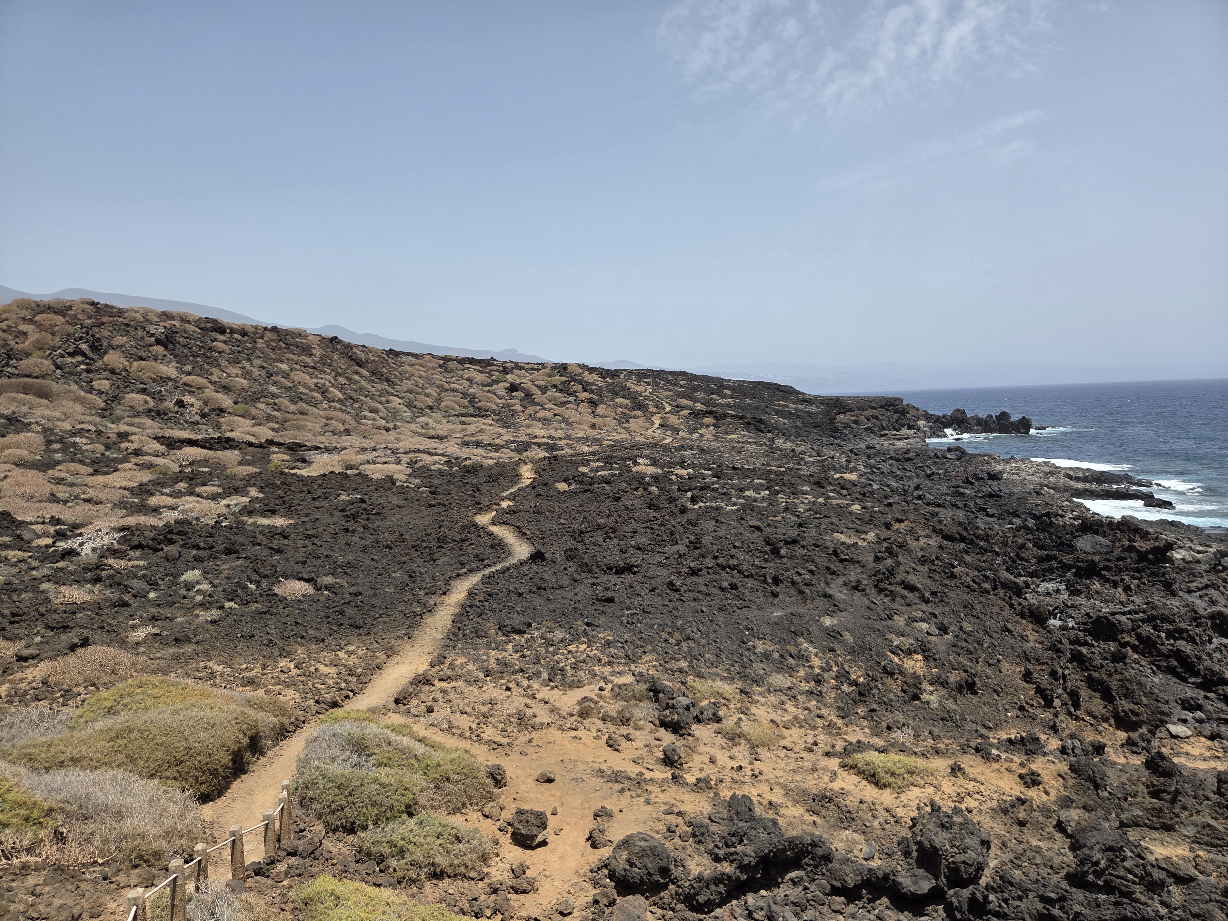Zum Einstieg lohnt ein weiter Blick über die verkrusteten Lavaströme Richtung Meer. Der Pfad zeichnet sich hell gegen das dunkle Gestein ab und macht sofort klar, warum das Gebiet „Malpaís“ – „schlechtes Land“ im Sinne von karg und unwegsam – heißt.
