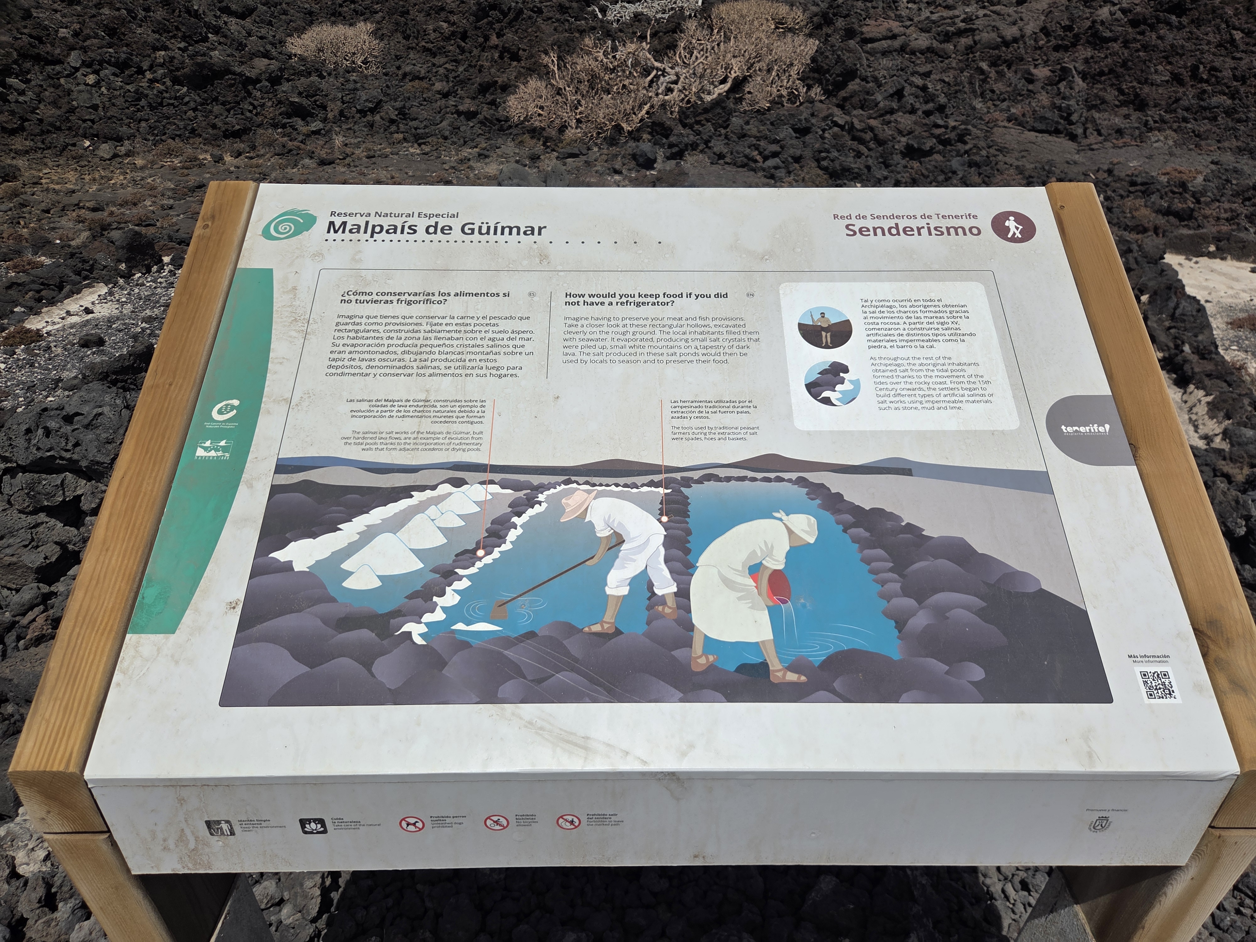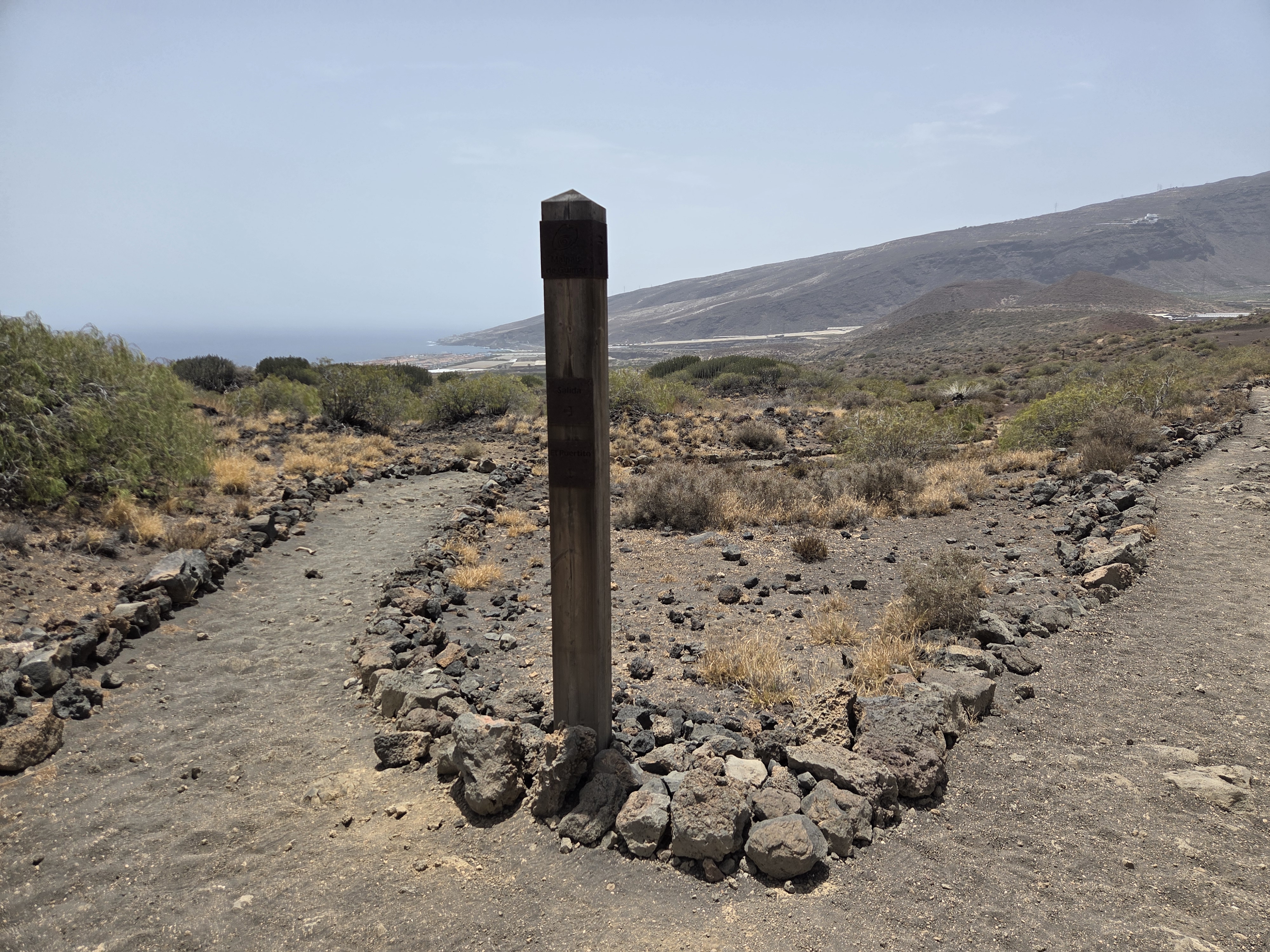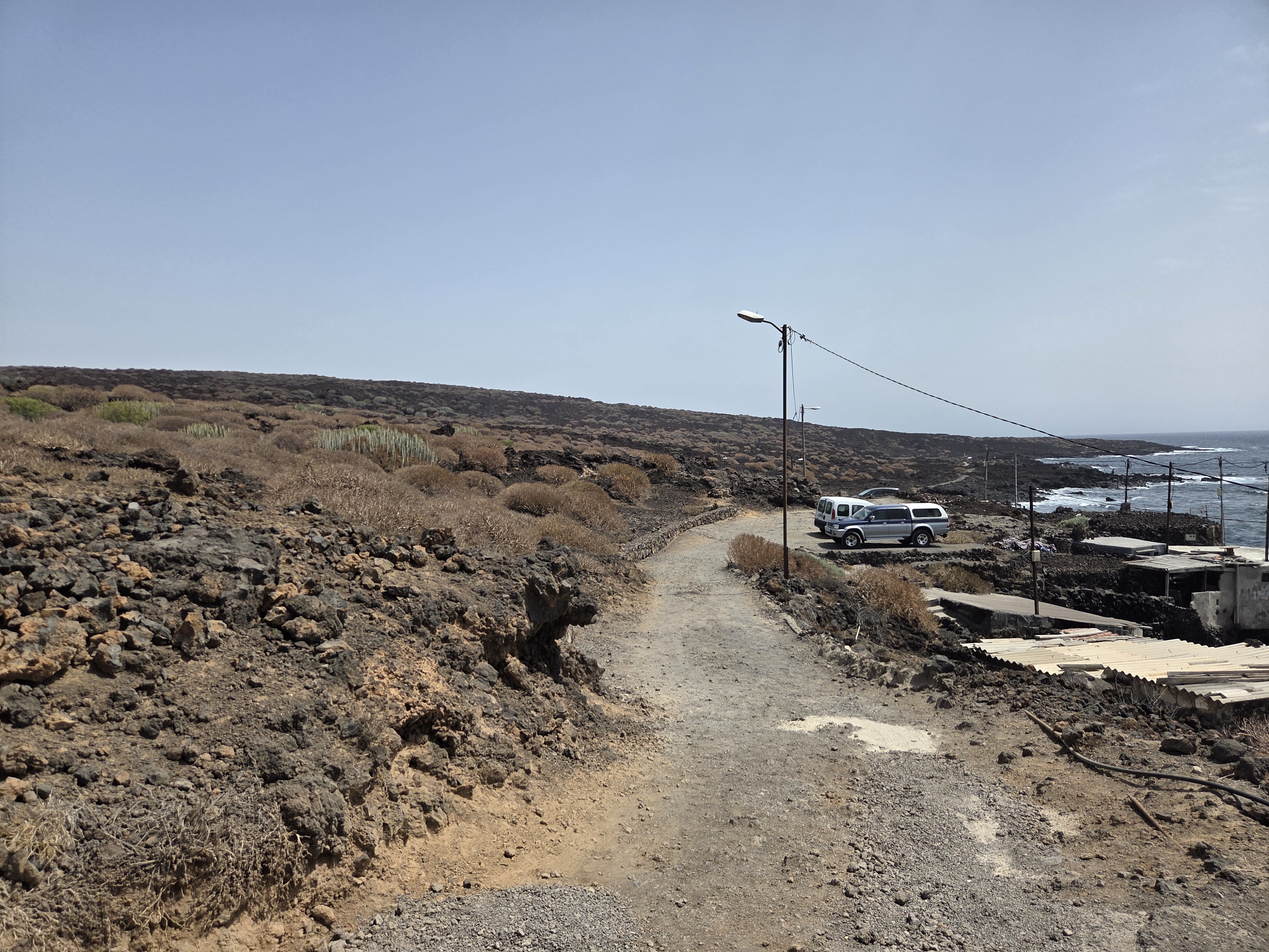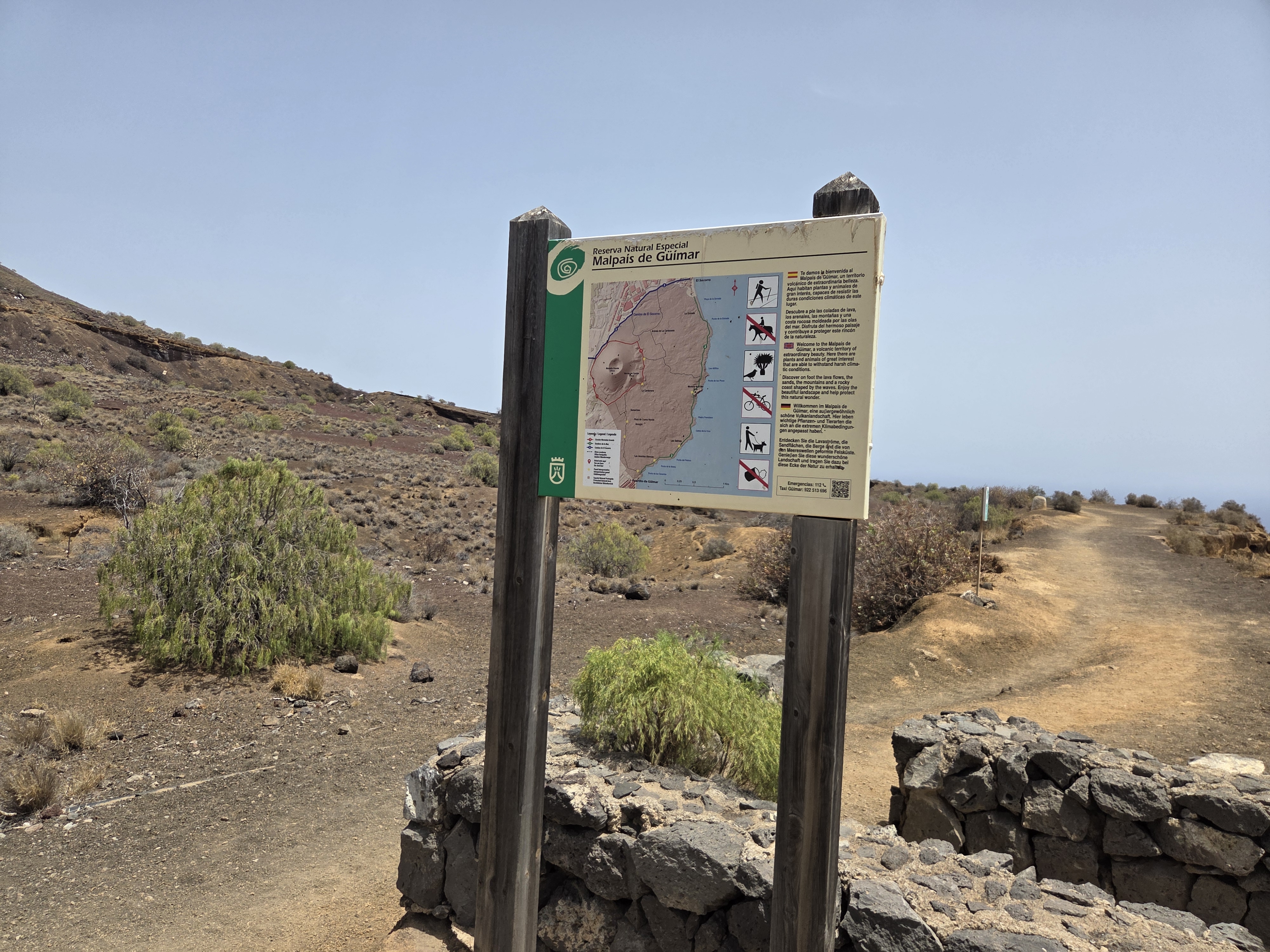 Zum Einstieg lohnt ein weiter Blick über die verkrusteten Lavaströme Richtung Meer. Der Pfad zeichnet sich hell gegen das dunkle Gestein ab und macht sofort klar, warum das Gebiet „Malpaís“ – „schlechtes Land“ im Sinne von karg und unwegsam – heißt.