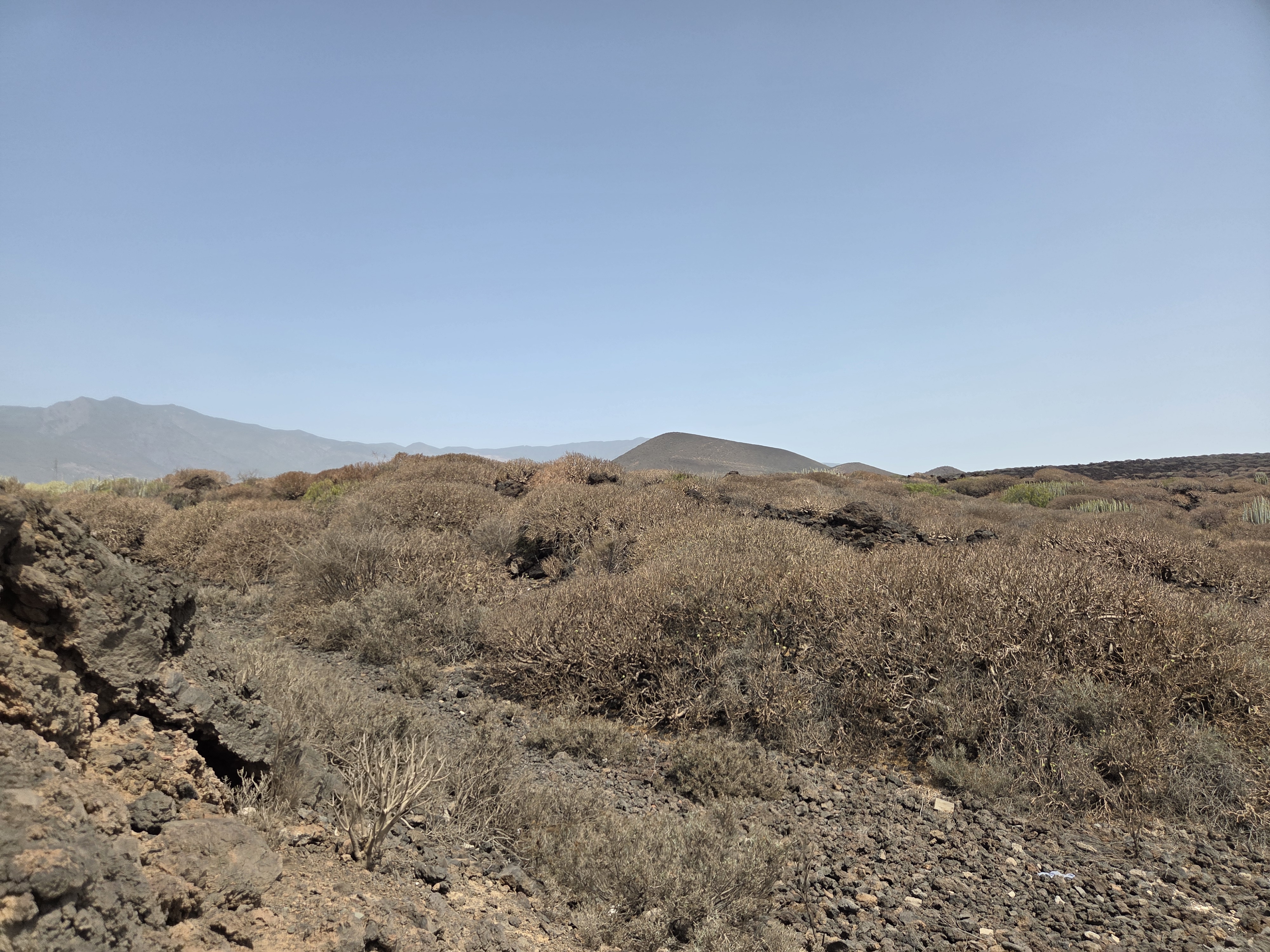 Abseits der Küste prägen niedrige, trockenheitsresistente Sträucher die Landschaft. Zwischen Aschepolstern und erstarrten Brocken wachsen Wolfsmilchgewächse und andere Spezialisten, die Wind und Salz standhalten.
