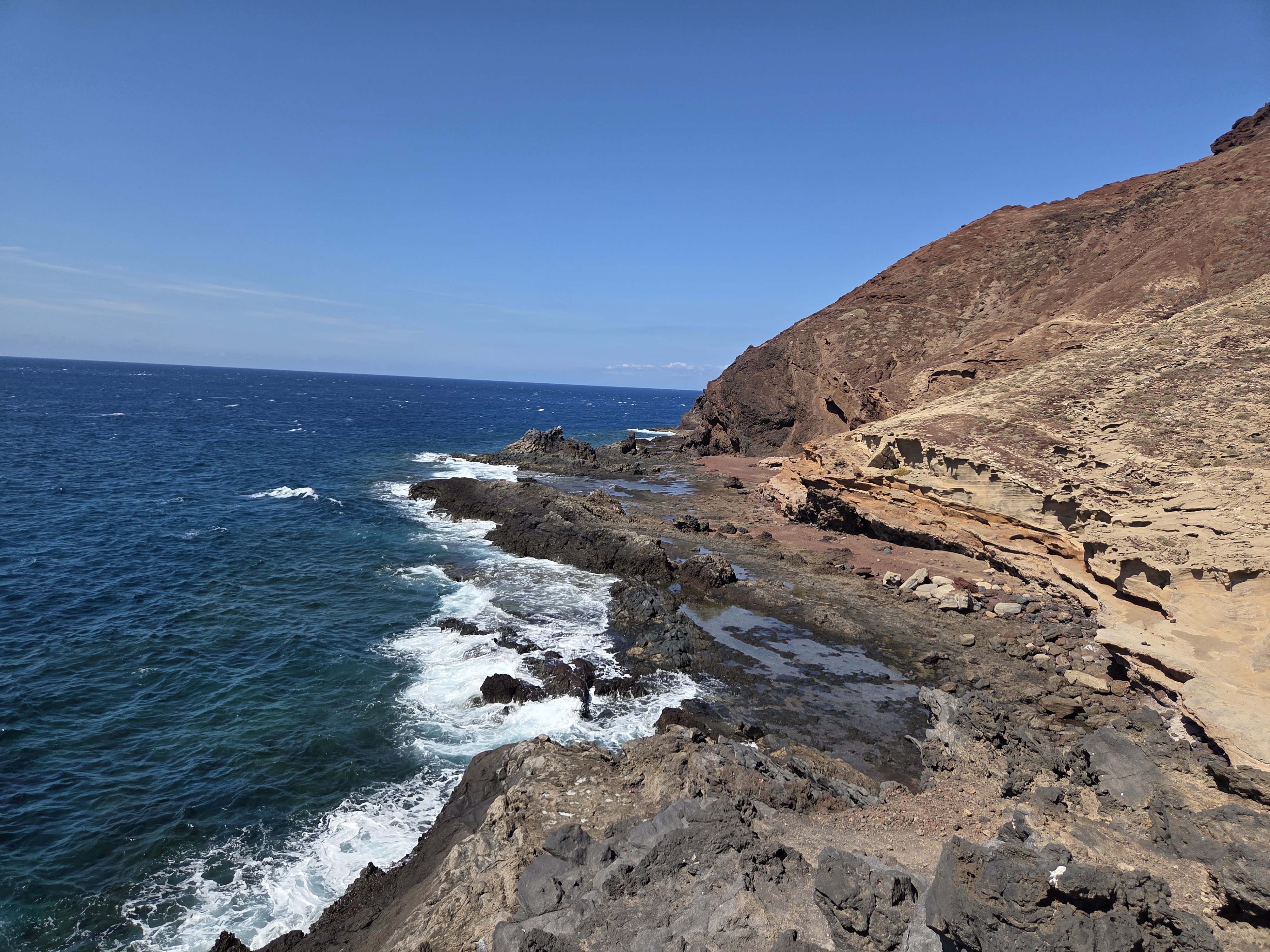 An der steinigen Südküste unterhalb des Kegels formt die Brandung kleine Becken und dunkle Felsbänder. Vorsicht bei Nässe: die Lava wird rutschig, und Strömungen können stark sein.