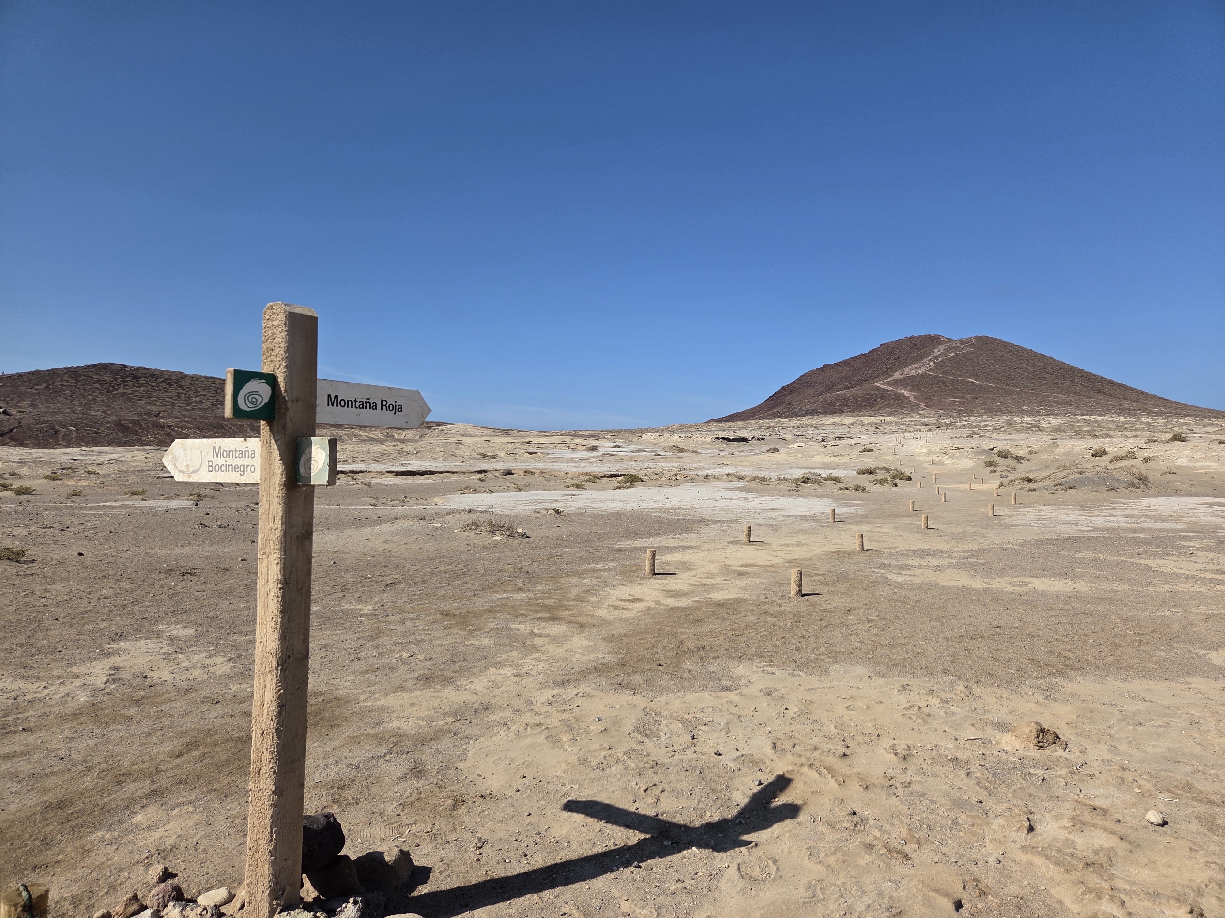 Der markierte Weg beginnt in der flachen Küstenebene. Ein Wegweiser im Reserva Natural Especial de Montaña Roja zeigt die Routen zur Montaña Roja sowie zur benachbarten Montaña Bocinegro. Bitte auf den markierten Pfaden bleiben – die Dünen und die Vegetation sind empfindlich.