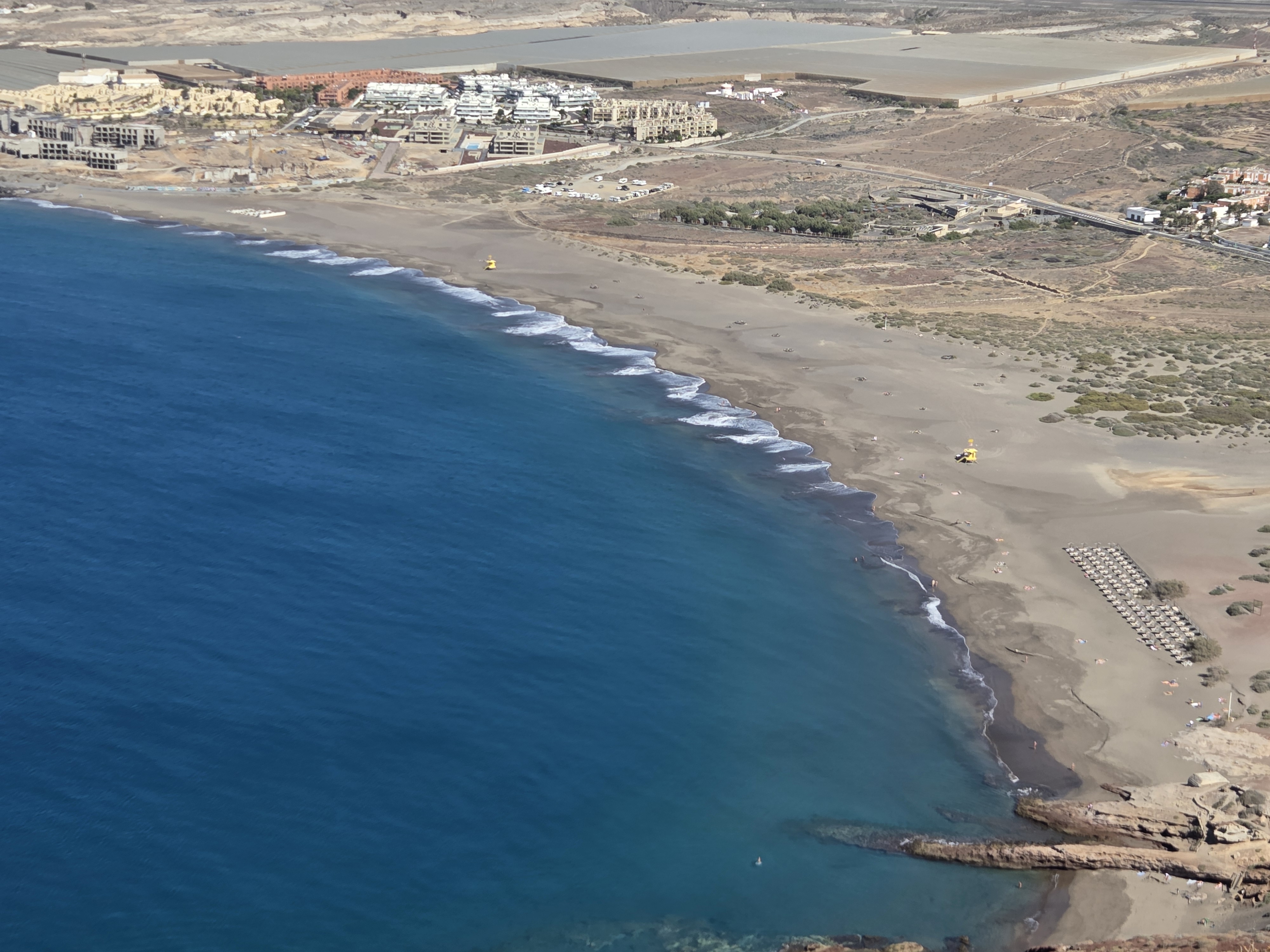 Am Westfuß der Montaña Roja liegt die Playa de la Tejita – eine lange, naturbelassene Sandbucht. Von oben sieht man die breiten Uferzonen und das klare Wasser, ideal zum Baden an windärmeren Tagen.